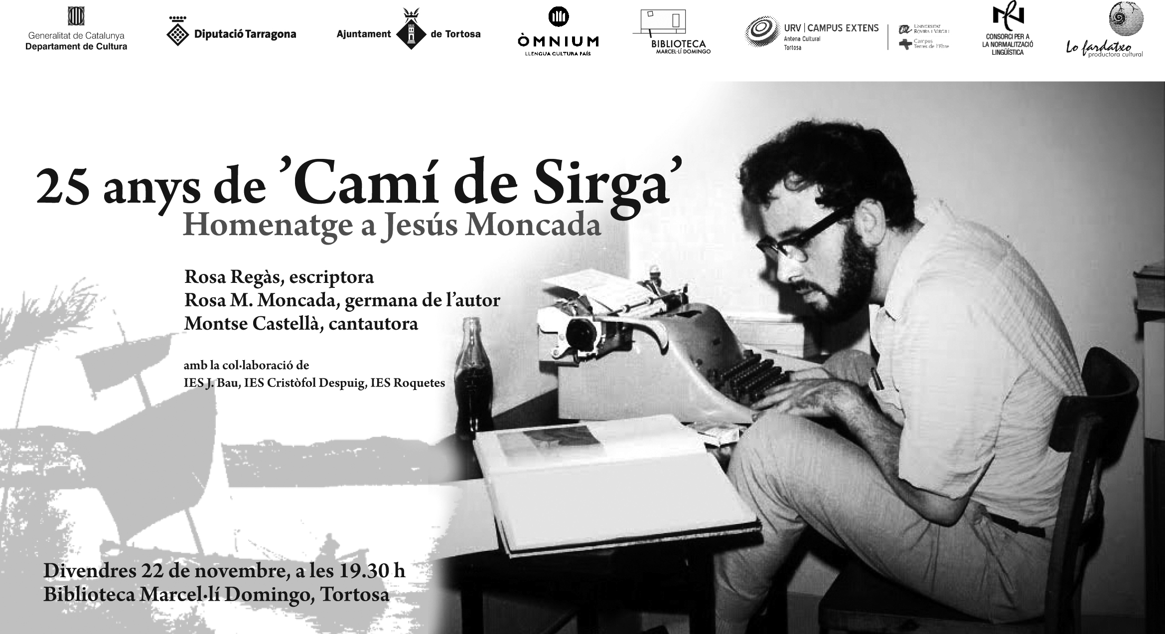 TORTOSA (Baix Ebre).- La Biblioteca Marcel·lí Domingo de Tortosa serà aquest divendres, 22 de novembre, l'escenari de l'homenatge ebrenc a Jesús Moncada (1941-2005), amb motiu dels 25 anys de la publicació de la novel·la 'Camí de sirga'. L'acte començarà a les 19.30 hores i comptarà amb les intervencions de l'escriptora Rosa Regàs, que pronunciarà una conferència; de la germana de l'homenatjat, Rosa Maria Moncada, que parlarà sobre la personalitat de Jesús Moncada, i de la cantautora tortosina Montse Castellà. L'homenatge està organitzat la seu territorial d'Òmnium Cultural i la productora cultural Lo Fardatxo, amb la col·laboració dels instituts J. Bau, Cristòfol Despuig i de Roquetes, a més diferents entitats i institucions de la ciutat, entre les quals el Centre de Normalització Lingüística de les Terres de l'Ebre (CNLT) o l'Antena Cultural de la URV.